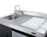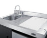 The ACK63GASBSS is a 63" wide kitchenette with an easy-fitting 24" depth. This unit comes with a stainless steel countertop offering durability in a professional look. The surface includes a small cutlery bin, with a removable cutting board cover to ensure easy food prep. The compact sink features a ready-to-use faucet. Underneath the sink is a large cabinet with a removable shelf for added storage convenience.