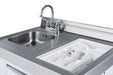 The ACK72ELSTW is a 54" wide kitchenette with an easy-fitting 24.25" depth. This unit comes with a stainless steel countertop offering durability in a professional look. The surface includes a small cutlery bin, with a removable cutting board cover to ensure easy food prep. The compact sink features a ready-to-use faucet. Underneath the sink is a large cabinet with a removable shelf for added storage convenience.